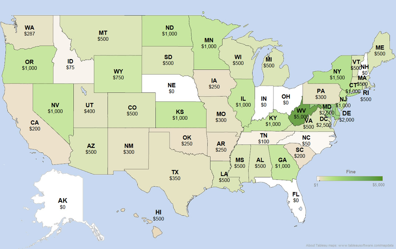 West Virginia by far has the most expensive fine while in the U.S. on $5,000, while Canada, Nebraska, Indiana, Ohio, The southwest and New Hampshire don’t enforce fines.